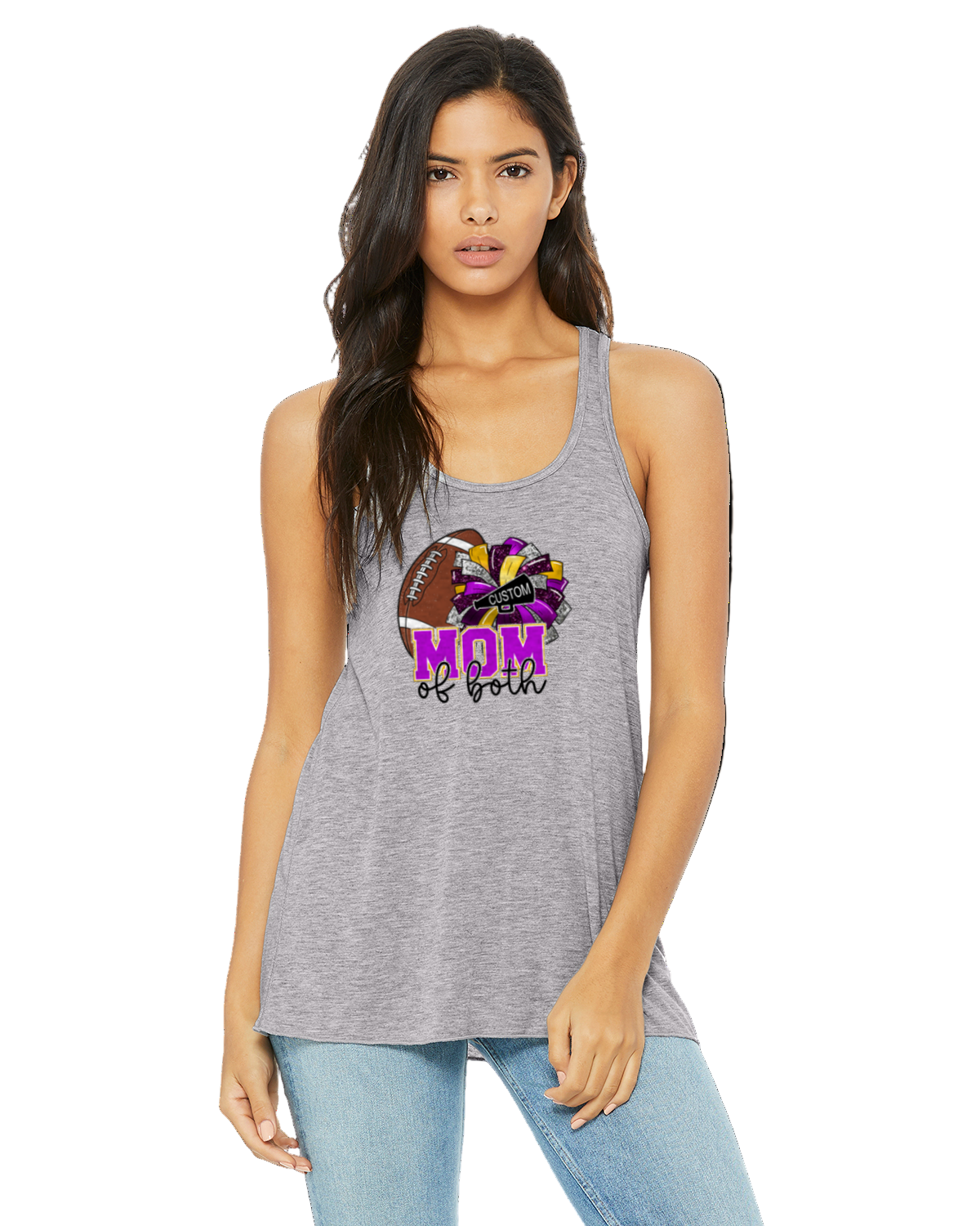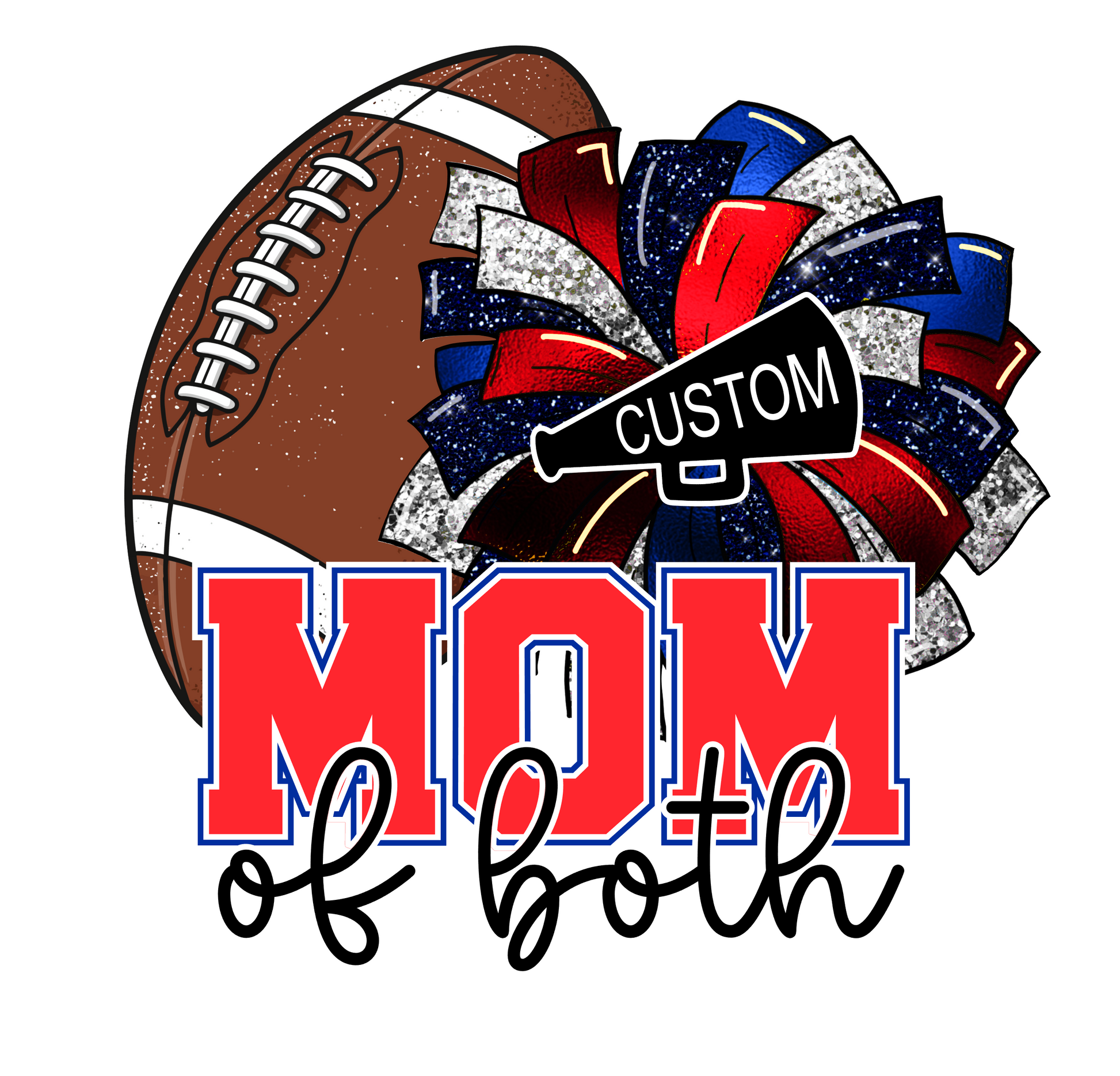 Cheer loud and proud with this bold and vibrant Mom of Both shirt! Featuring a glitter-style bow design in your schoolβs custom colors and a classic cheer megaphone, this tee is perfect for supporting your favorite cheerleader on game day, competitions, or pep rallies.