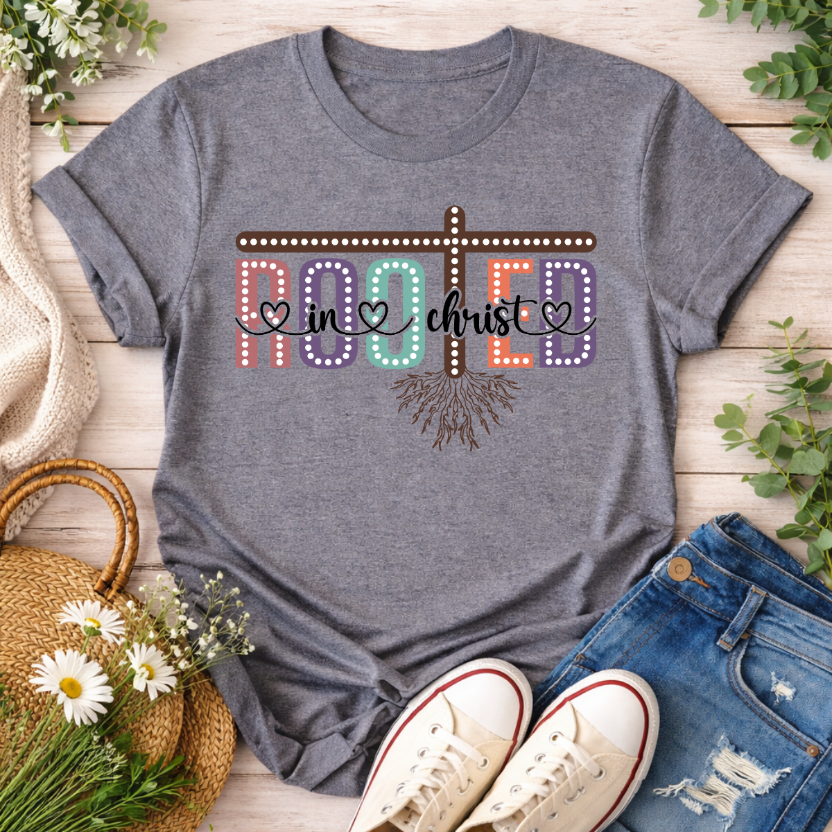 This stylish graphic tee features the word “Rooted” with a cross and roots design, accented by soft, colorful lettering and the phrase “in Christ.” Comfortable and easy to wear, it’s a meaningful everyday shirt that reflects faith, strength, and grounded belief. Perfect for casual outfits or as a thoughtful gift.